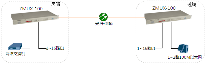 局端站與遠端站間通過光纖點對點通訊。局端站1~16路E1接口(2M接口)及1~2路共享速率100M以太網(wǎng)接入到ZMUX-100后轉換成光信號,再連接上光纖傳輸?shù)綄Χ苏具€原出來。