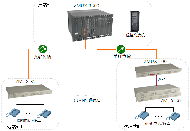 遠端N的ZMUX-30接入60路電話(可選配其它業(yè)務)復用成2路E1信號,通過E1接口(2M接口)級聯(lián)ZMUX-100,再轉換成光信號,通過光纖傳輸?shù)綄Χ巳ァ?/p>